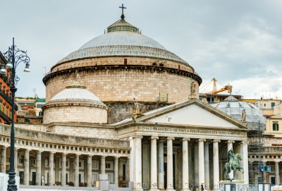 19世纪初,那不勒斯国王由波拿巴家族的国王若阿尚·缪拉开始建造,他规划了广场及其建筑以献给拿破仑。拿破仑失势后,波旁王朝复辟,斐迪南四世继续完成建筑,但是在1816年建成后归属教会,奉献给16世纪曾在此修道的保罗圣方济。教堂模仿了罗马的万神庙,正立面和两边带有柱廊,穹顶有53米高。